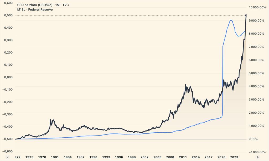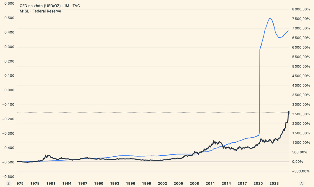 Słowo wyjaśnienia także w kwestii dlaczego stosujemy wykresy od 1975. Pomimo, że sierpień 1971 uchodzi za datę zerwania (formalnie zawieszenia) parytetu złota i USD, to w praktyce legislacja umożliwiająca komukolwiek detaliczne nabywanie złota została wprowadzona w życie 1 stycznia 1975. Co ciekawe jeśli wyznaczymy ten sam wykres M1 w USA i notowań uncji złota od sierpnia 1971 (myślę, że wielu może patrzeć na tę datę bez wchodzenia w szczegóły) to obraz będzie istotnie różny: